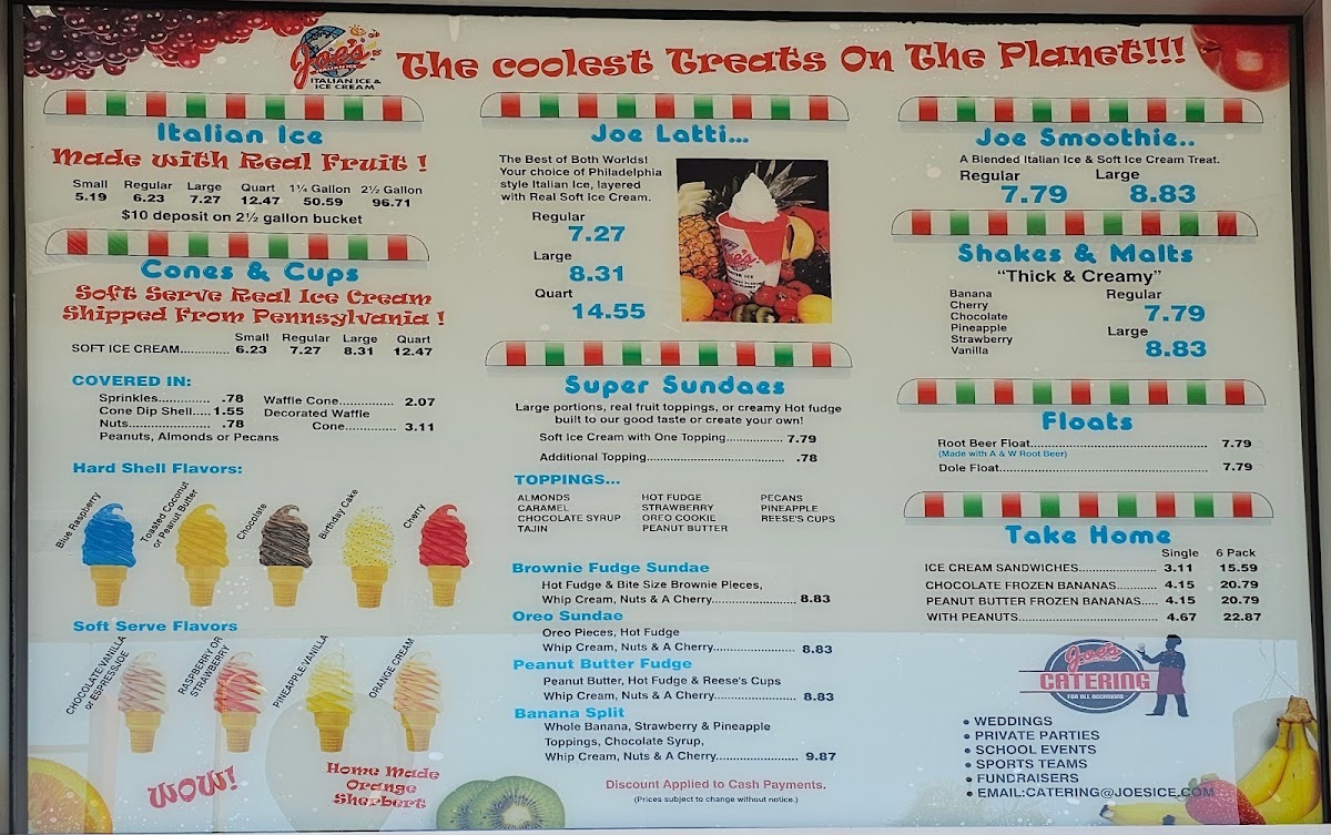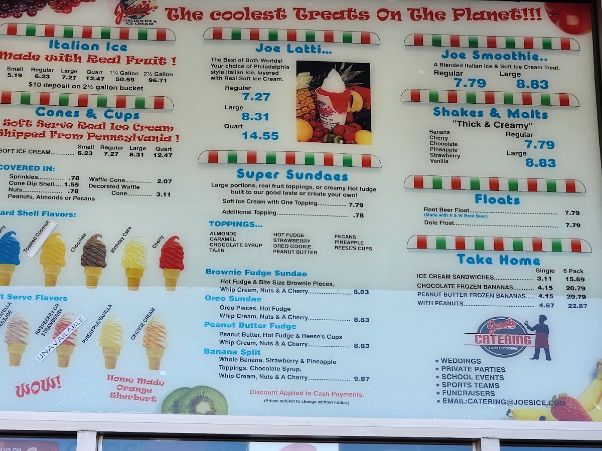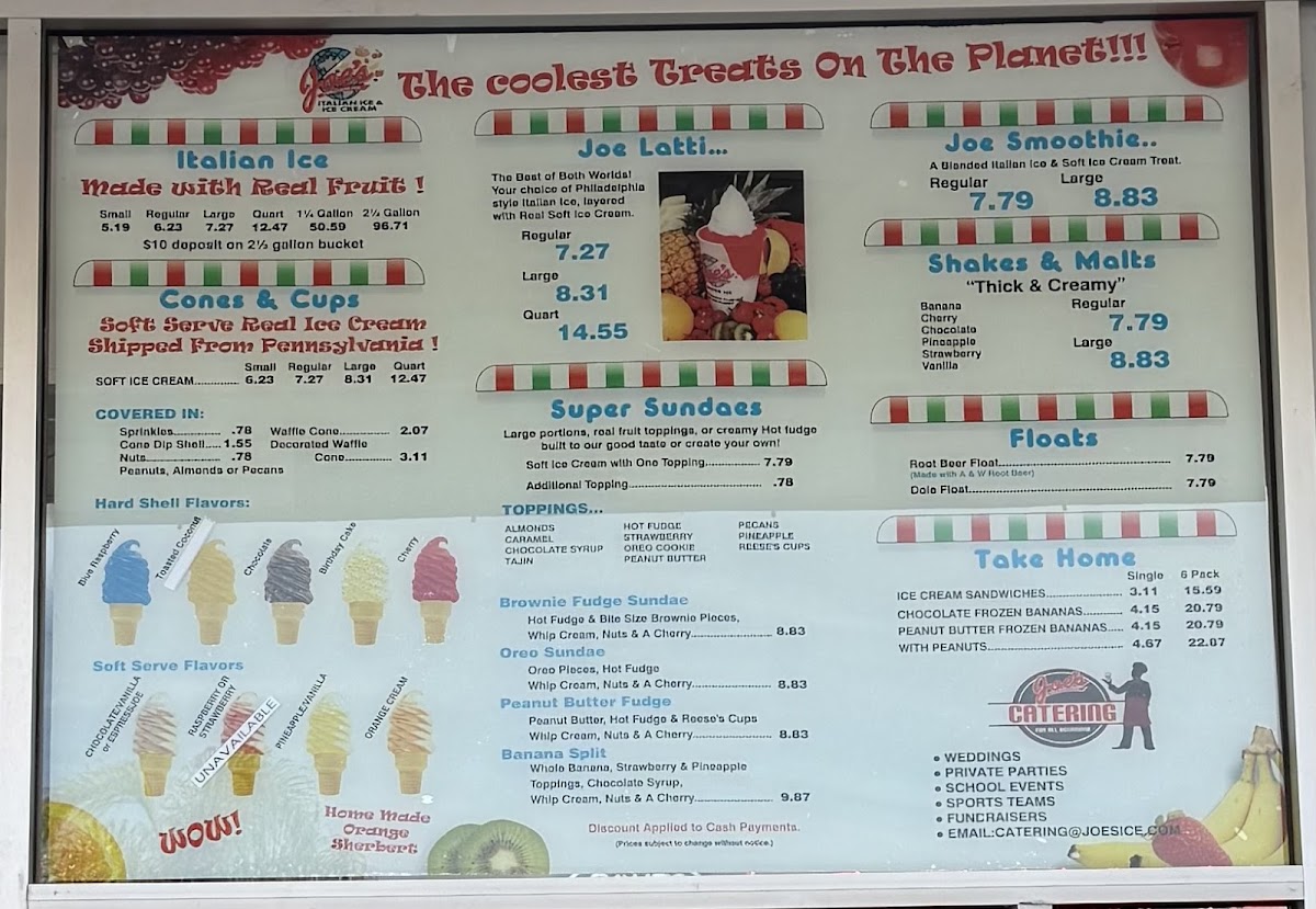 Joe's Italian Ice is more than just an ice cream shop; it's a sanctuary for those seeking a sweet escape. With menu offerings like the Joe Latti ($8.95) – a delightful blend of Italian ice and creamy soft serve – and a variety of Italian ice flavors starting at just $6.57, you'll find yourself transported to a realm of frozen bliss. The Soft Serve ($8.04) is indulgently rich, ensuring every lick and scoop delivers a wave of creamy goodness.